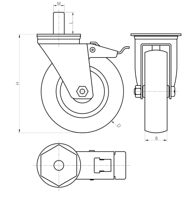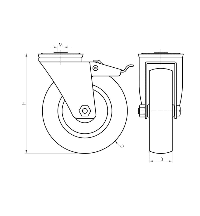 Product name Product code Load capacity (kg) Width B (mm) Board size S (mm) Fastening Diameter D (mm) Hole spacing R (mm) Brake Length L (mm) Hole / Thread Height H (mm) Quantity